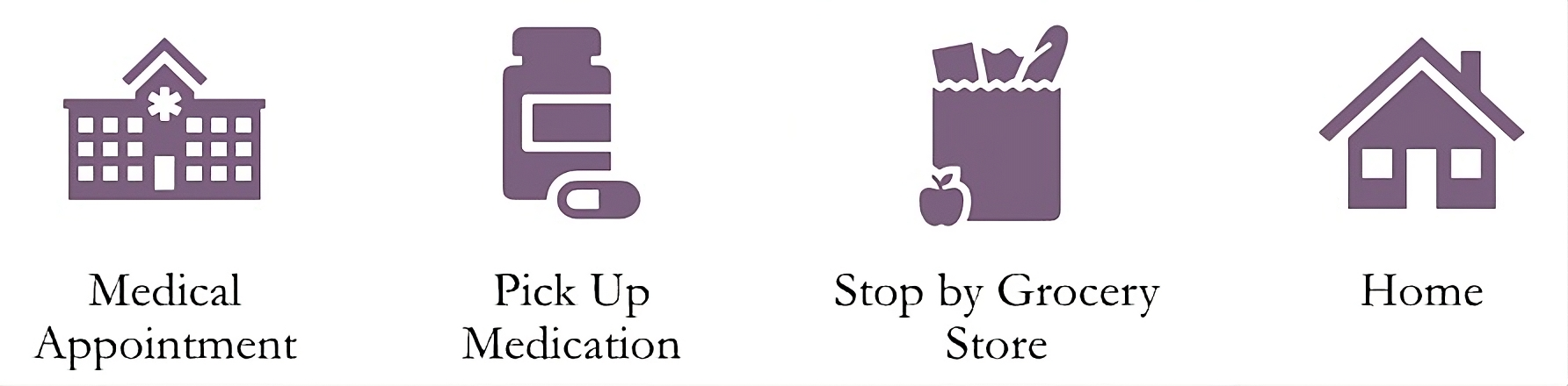Volunteer driver programs often have the flexibility to expand beyond typical trips to essential or basic (e.g., medical appointment, grocery store) services. For example, a rider might request a trip with multiple stops on the same day (e.g., 1. medical appointment --> 2. pick up medication --> 3. stop by grocery store --> 4. home).