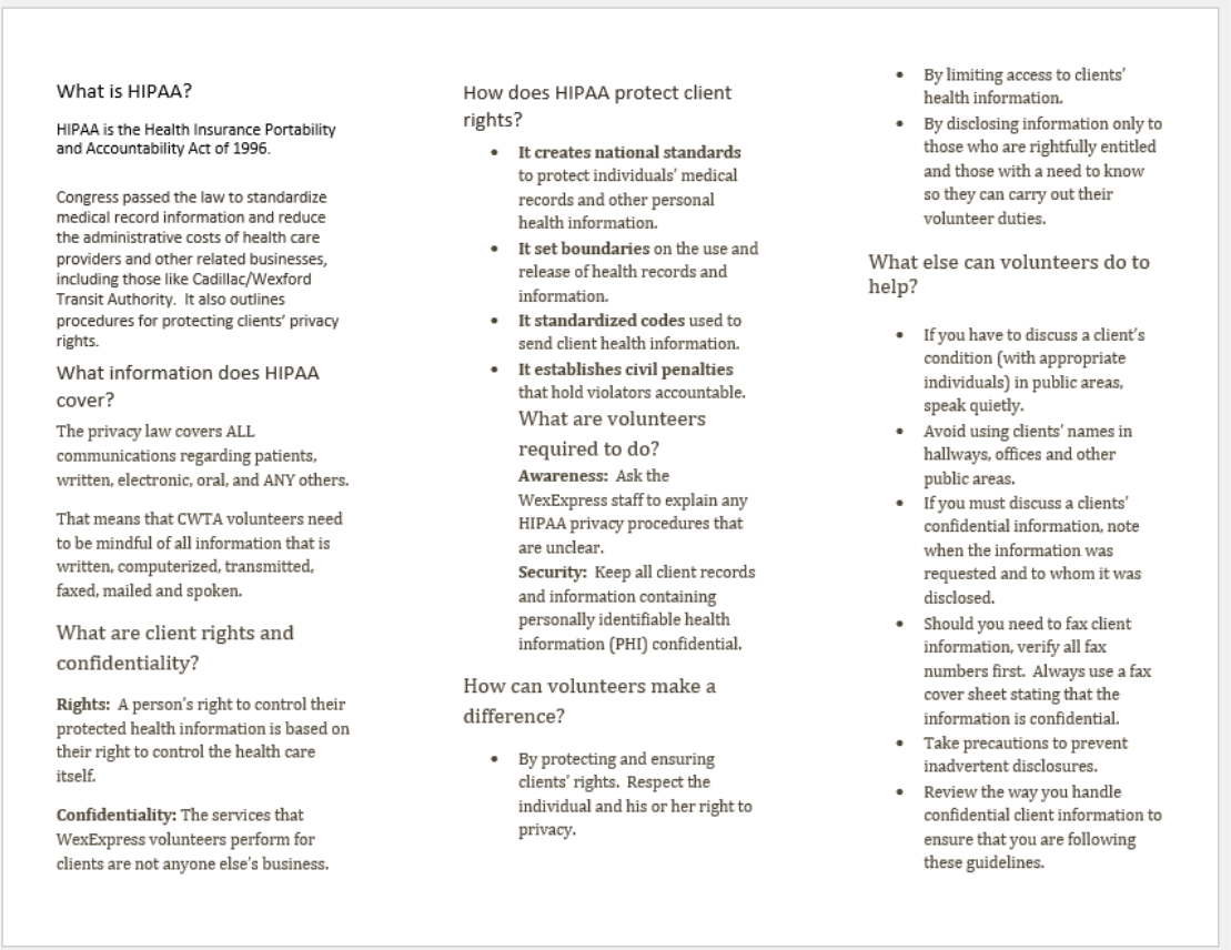 Section 3: Important Information About Riders speaks to the needs of riders. It is important that riders understand the scope of services that the volunteer driver program is able to provide. The resources included here are outstanding examples of rider guides that include necessary information and guidance for riders.