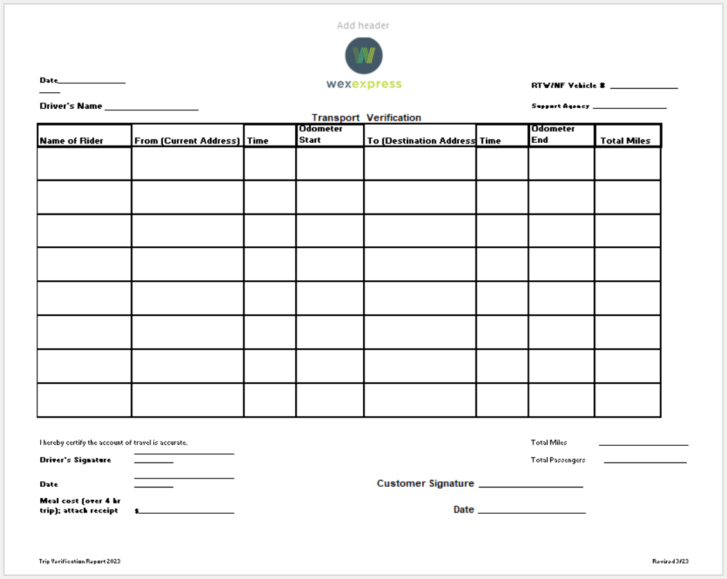 Transport Verification (form), WexExpress New Freedom Program, 2023