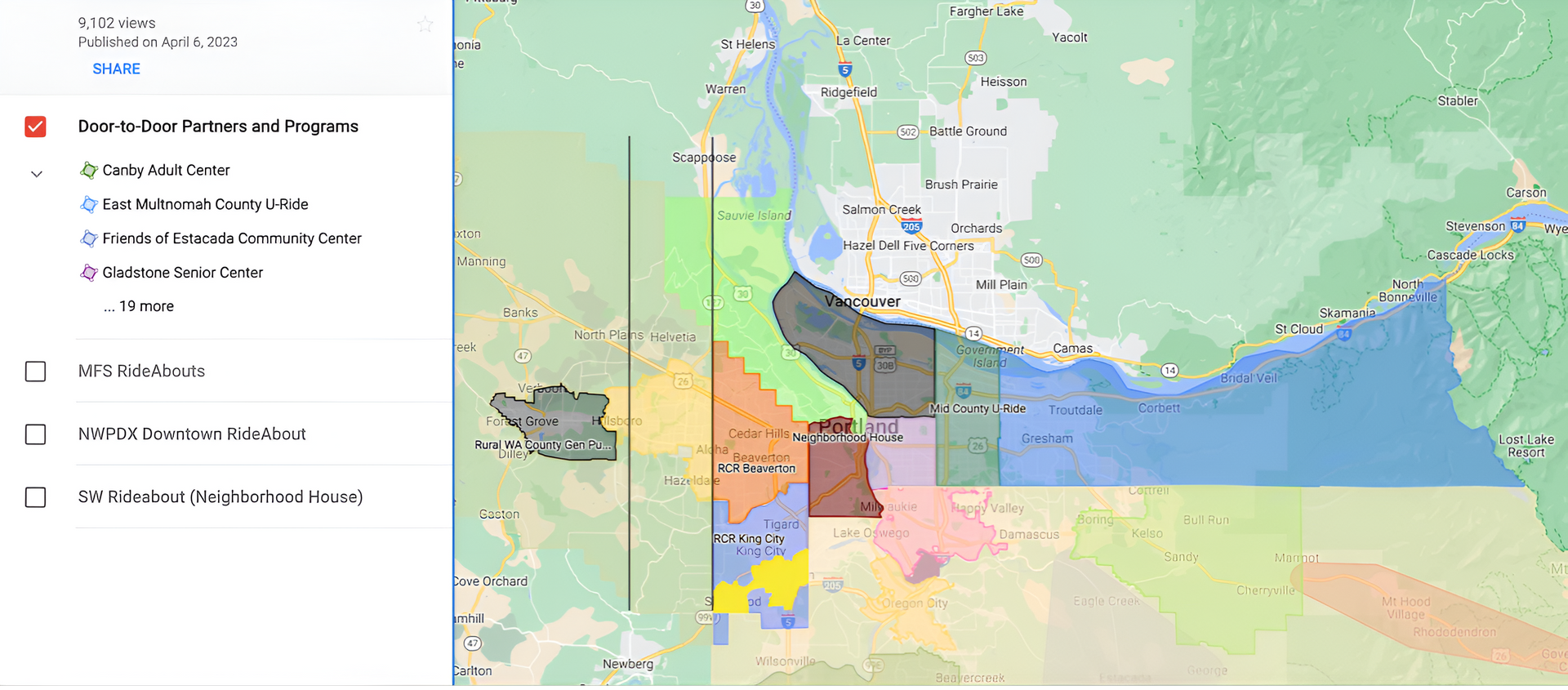 The Portland metro area is divided into eight regions, each with designated volunteer ride providers. Ride Connection acts as the "parent" agency, serving as the primary transportation provider in some areas and a supporting agency in others. Volunteer drivers either use their personal vehicles (with mileage reimbursement) or agency vehicles, of which there are approximately 40 available.